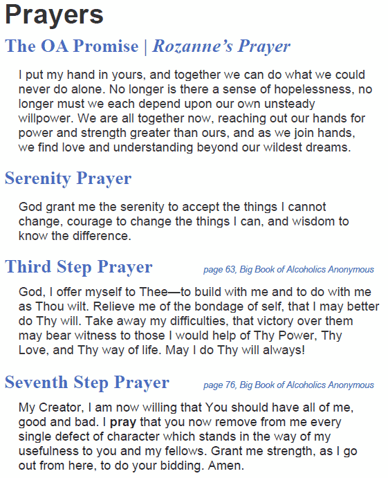 What prayers are recommended to use at a meeting? The World Service Business Conference of 1993 agreed that OA meetings and events be closed with one of the following prayers: the Serenity Prayer, the Third Step Prayer (BB p63), the Seventh Step Prayer (BB p76) , or the OA Promise I Put My Hand in Yours.